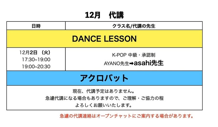 急遽代講となった場合、クラスのオープンチャットへご連絡させていただきます❗️