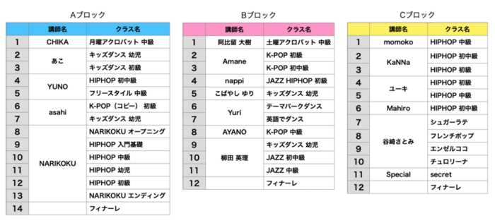 出演クラスのブロックをお間違いないように必ずご確認お願いします。