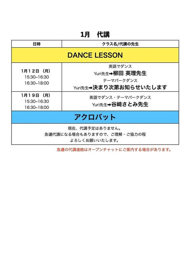インフォメーション 1月スケジュール&代講情報 新年あけましておめでとうございます 12月のスケジュールと代講情報のお知らせです‼️ 急遽代講となった場合、クラスのオープンチャットへご連絡させていただきます❗️ 体験・振替などで受講する際は、代講情報のご確認、LINEでお問い合わせお願いいたします🙇♀️ studio WILDKIDS